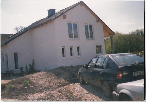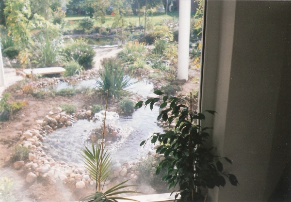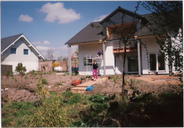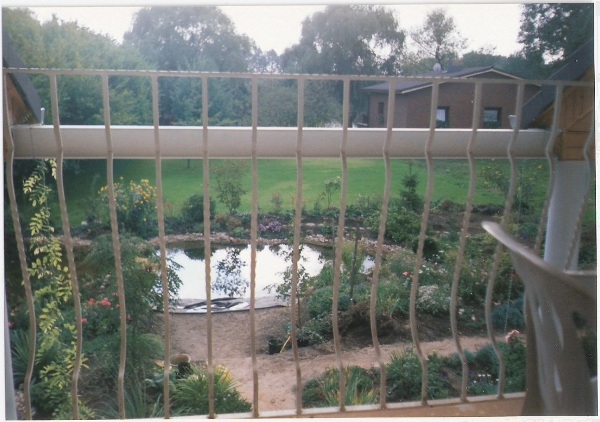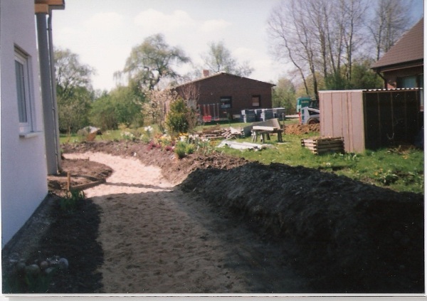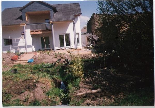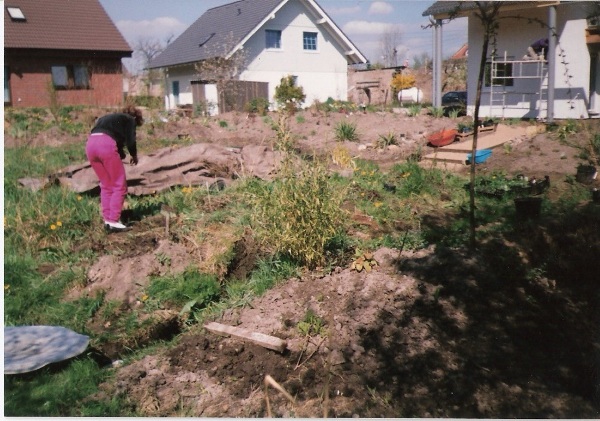 …und die Nachbarhäuser sind noch ganz nahe, von Geborgenheit keine Spur… Dort wo jetzt noch die Abdeckplane liegt, entsteht wenig später der große Teich, Der in Handarbeit ausgehobene Teich ist fast fertig. Für die Gestaltung des Randes und des